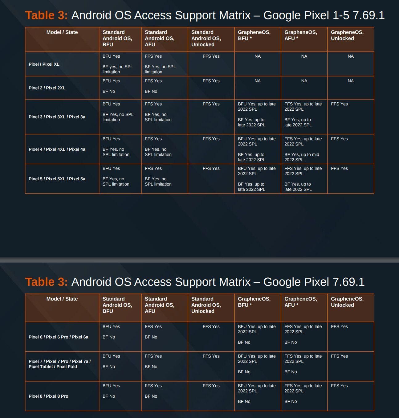 Cellebrite's list of capabilities provided to customers in April 2024 shows they can successfully exploit every non-GrapheneOS Android device brand both BFU and AFU, but not GrapheneOS if patch level is past late 2022. It shows only Pixels stop brute force via the secure element.