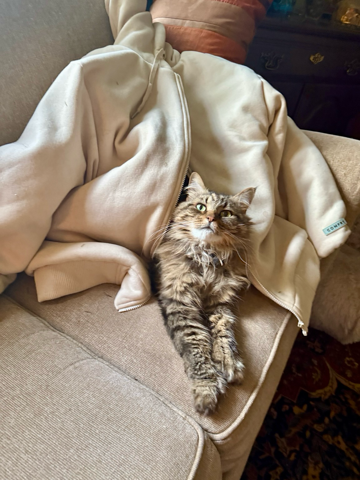 Emily is obsessed with this hoodie, and the cattitude when I threatened to take it away for washing is strong. It's hers now, at least according to her. #cats #CatsOfMastodon #caturday