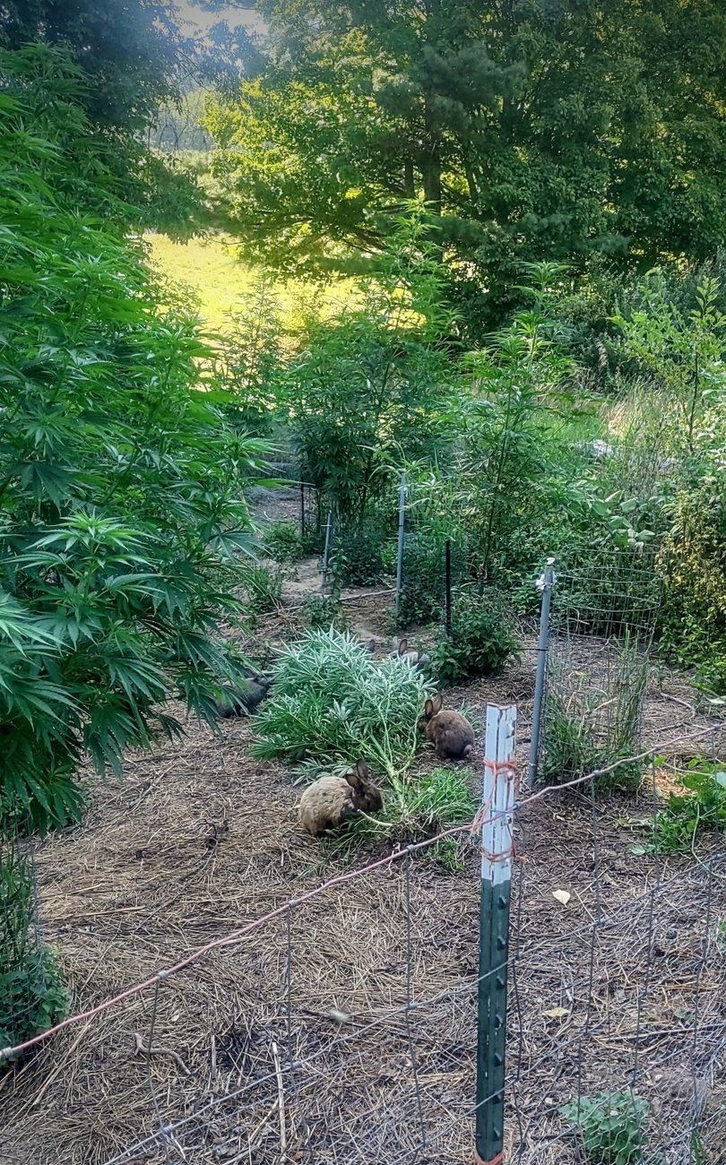 Rabbits living free in a colony system amongst large cannabis plants both weed and fertilize the plants. The cannabis also makes up a meaningful portion of the rabbits diet. In the fall during harvest, I will weave the mature ripe cannabis branches in... show more