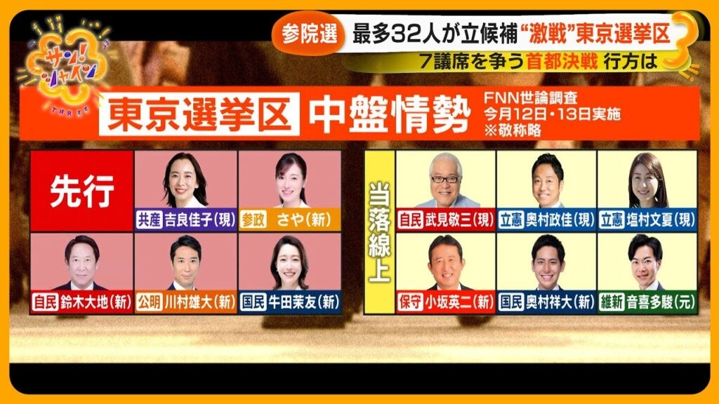 【参院選あと3日】最多32人が立候補 “激戦 “ 東京選挙区① 7議席を争う首都決戦の行方は ~もっと投票の前に~【サン!シャインニュース】 www.yayafa.com/2436429 #Broadcast #cast #entertainment #FRIDAY #Fuji #fujitv #information #japan #Monday #NETWORK #News #Sports #tanihara #Thursday #Tuesday #variety #Wednesday #weekdays #アナウンサー #エンタメ #カズレーザー... show more