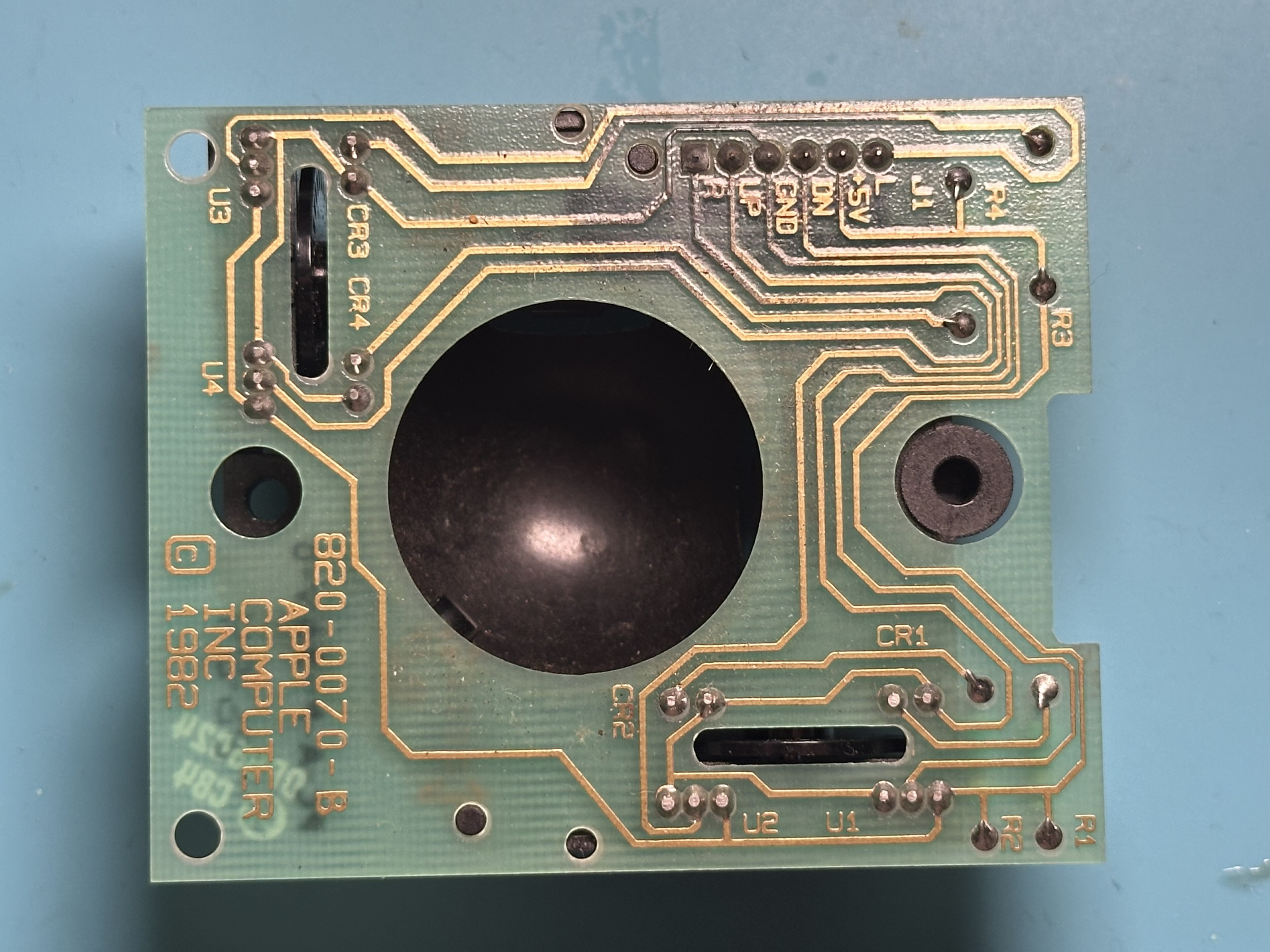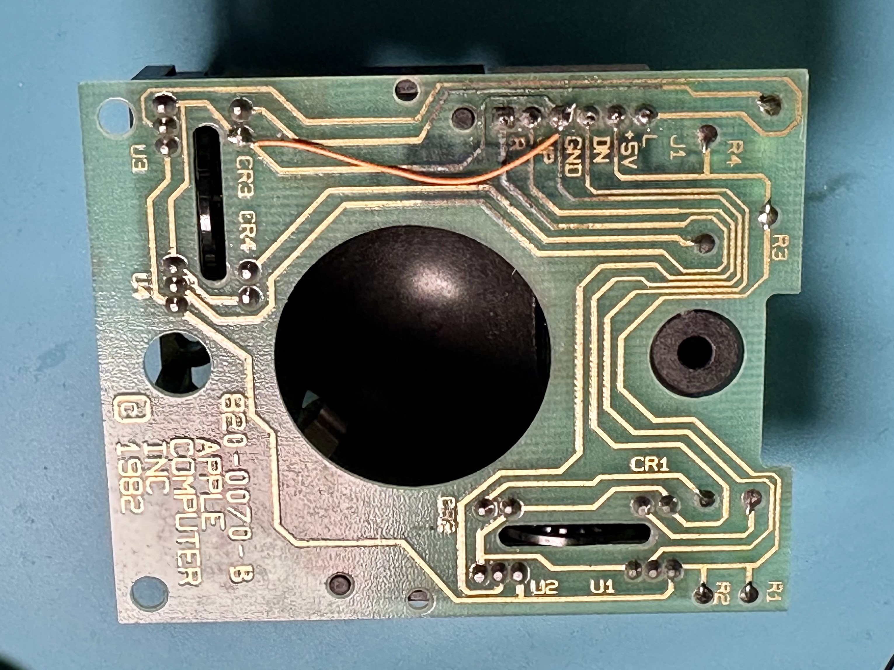 The left-right direction on the mouse wasn’t working. I opened it up and it looks like something has corroded it a bit. Worked out that the ground trace to the L-R sensor was open circuit so I added a bodge wire and now it’s working! #RetroComputing #VintageMac #VintageApple